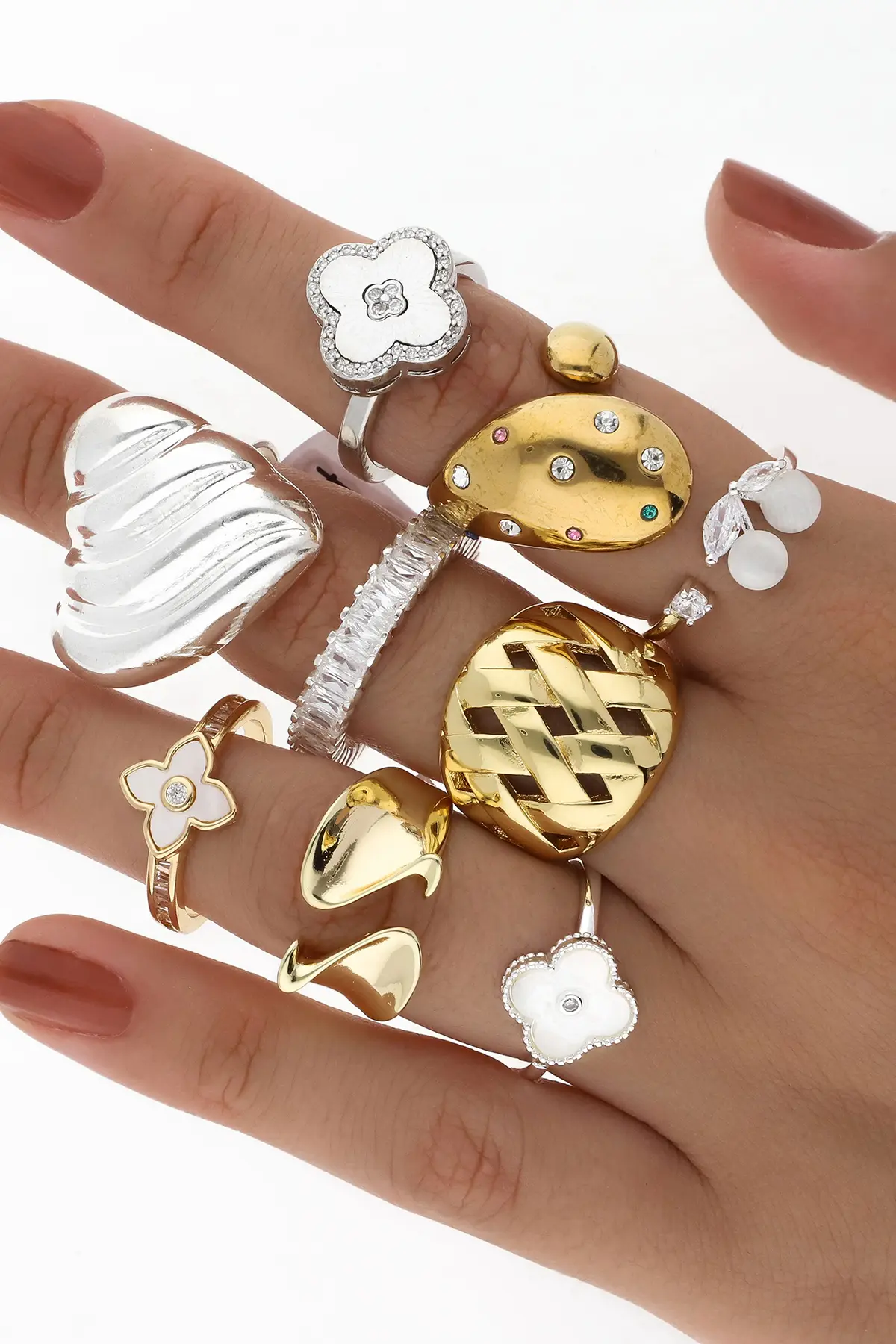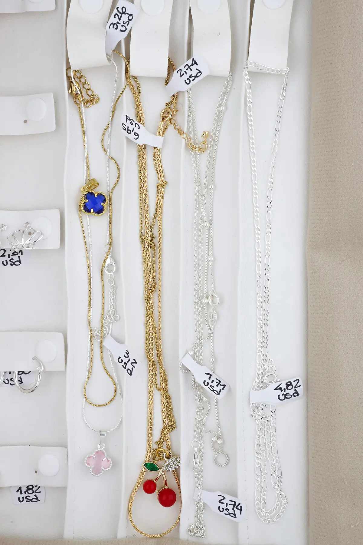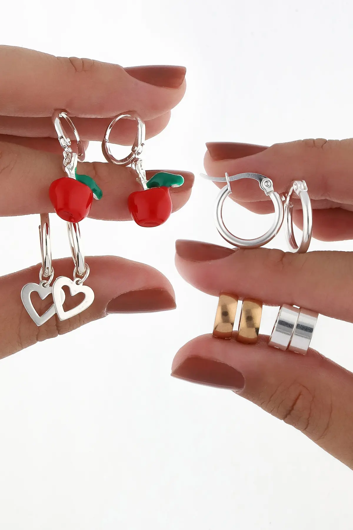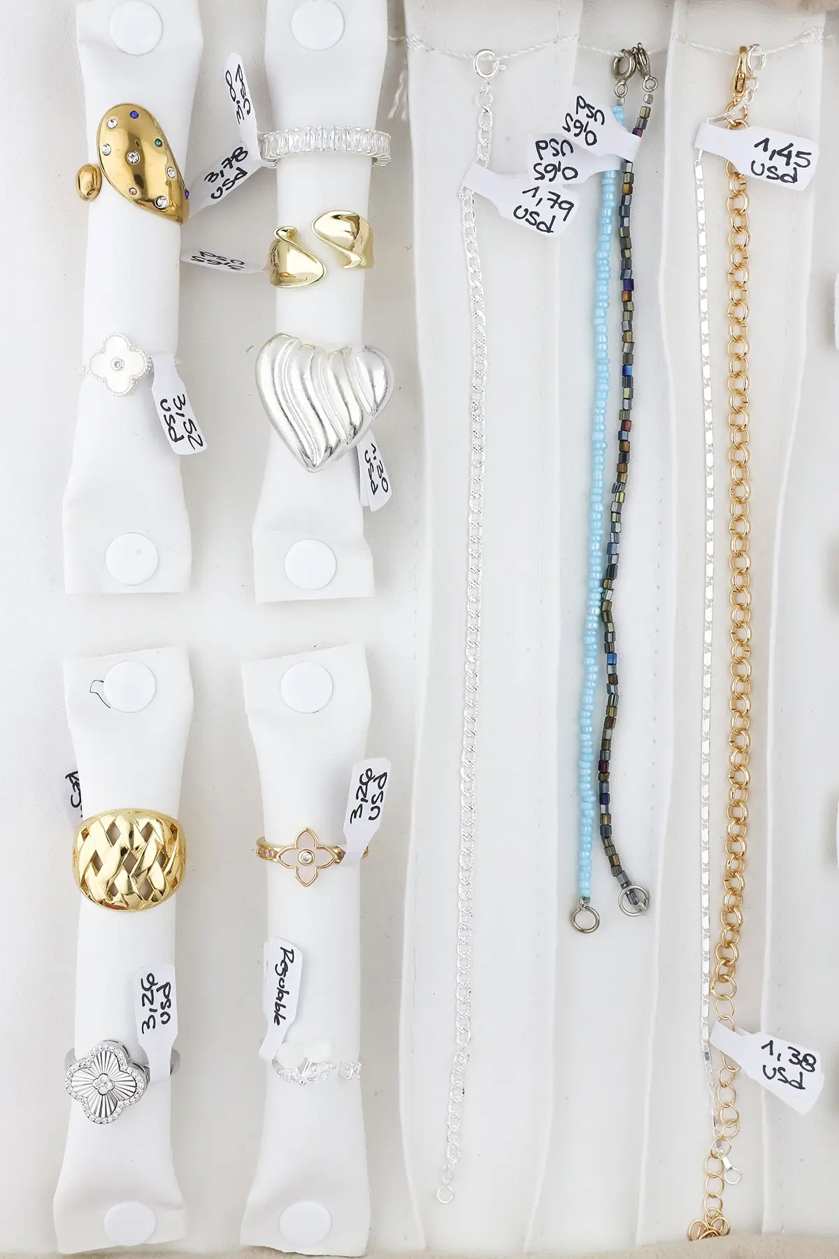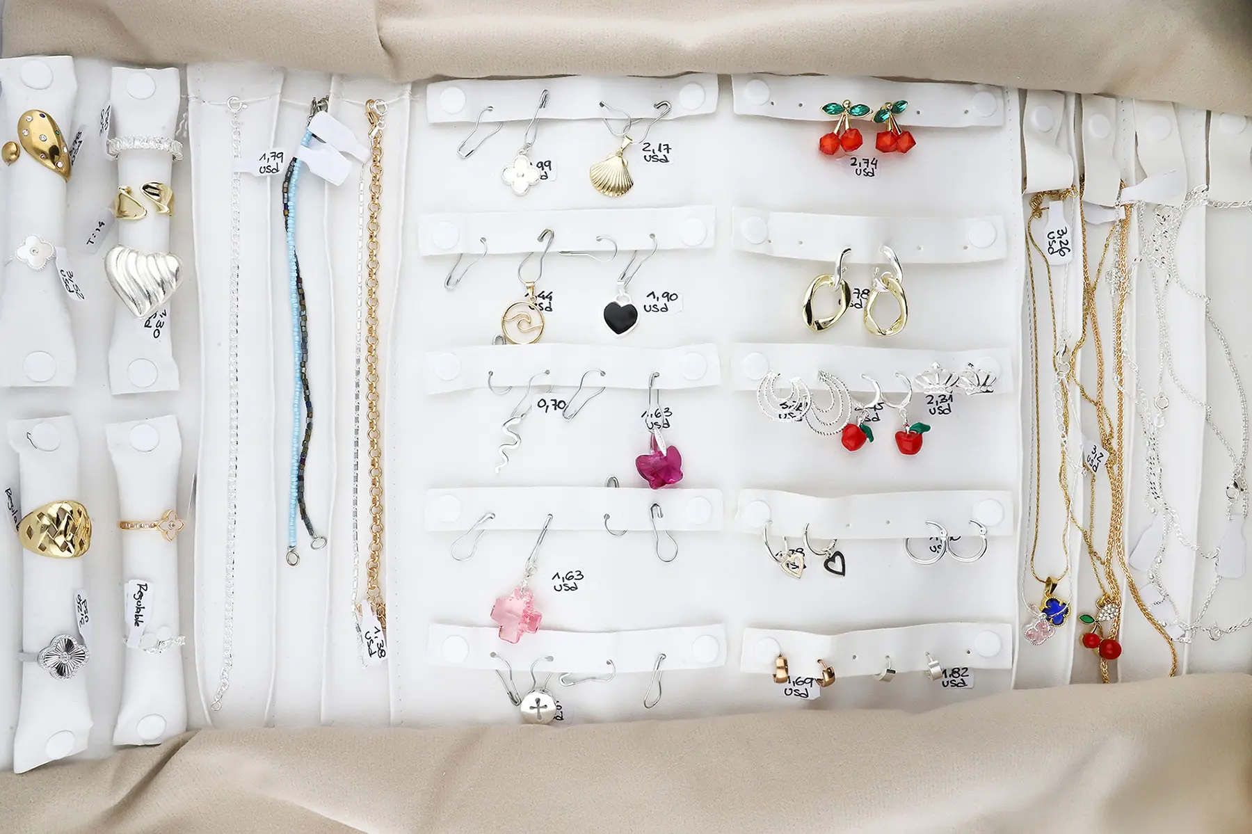 Incluye paño porta joyas, anillos, dijes, pulseras, aros y cadenas.